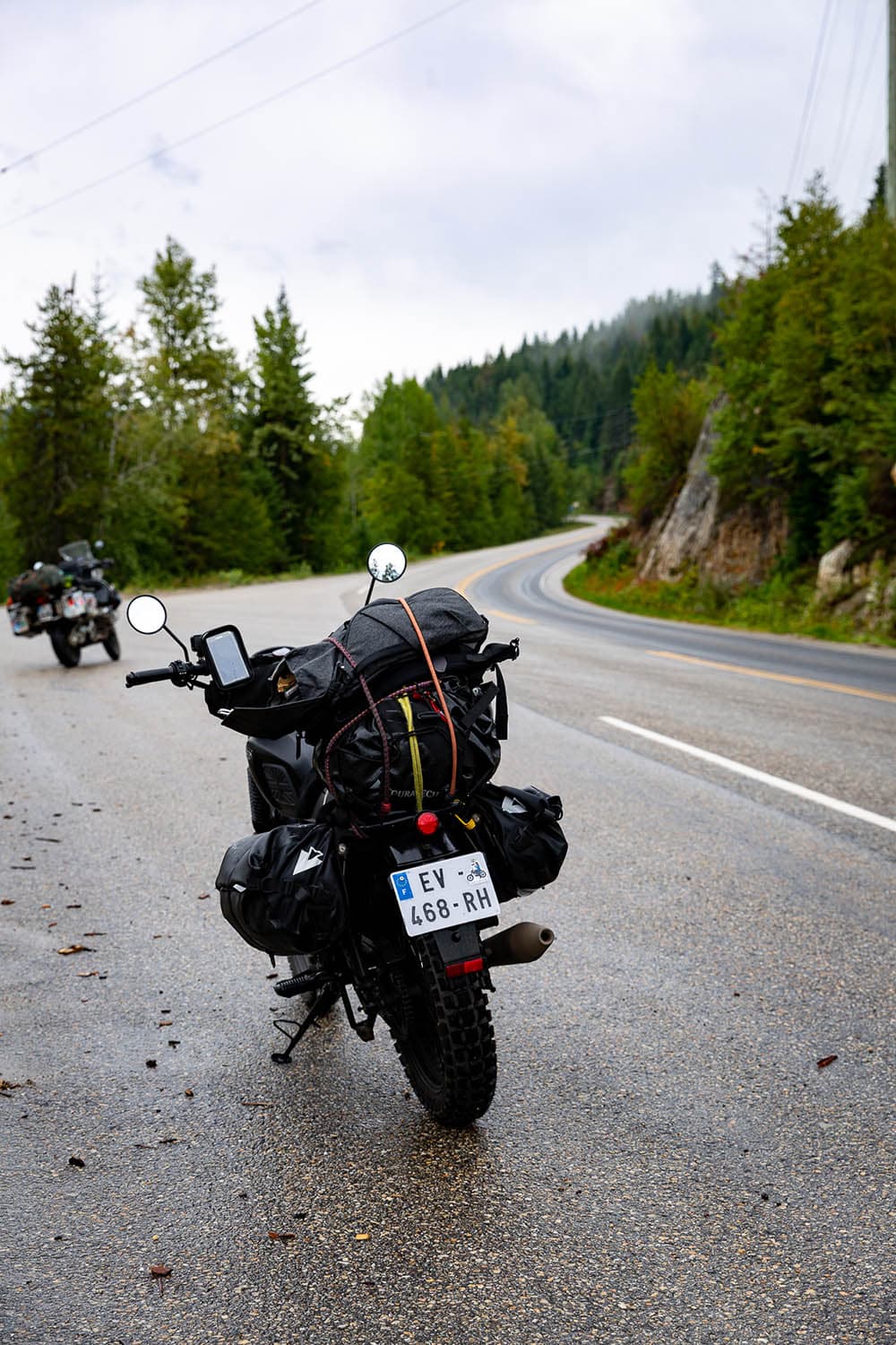 To reach the valley, we first follow the Trans-Canada highway through Glacier National Park before reaching Revelstoke. Here, I finally find a rope to attach to Chaton’s saddle and to fix my bags. So far, I was fixing the luggage straps to the saddle and whatever part of the bike I could find. With mixed results… But with this new rope, which goes around the saddle, I think I might have finally found a fitting solution.