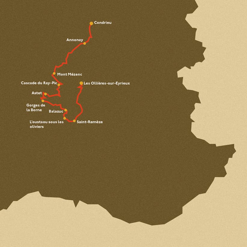 Το δρομολόγιό μας ήταν να πάμε στο Condrieu (εξαιρετικό κρασί) / Mont Mézenc / Cascade du Ray Pic / Gorge de Borne / Balazuc / Pont d’Arc & Les gorges de L’Ardèche / Gorges de l’Eyrieux. Η φίλη μου και εγώ περάσαμε τρεις ημέρες εξερευνώντας αυτή την εκπληκτική περιοχή της Ardèche. Ανακαλύψαμε την ομορφιά του αρχαίου ηφαιστειακού τοπίου της, το οποίο περιλαμβάνει πανοράματα, διάσημα φαράγγια και αυθεντικά παλιά χωριά, όπως το Balazuc.