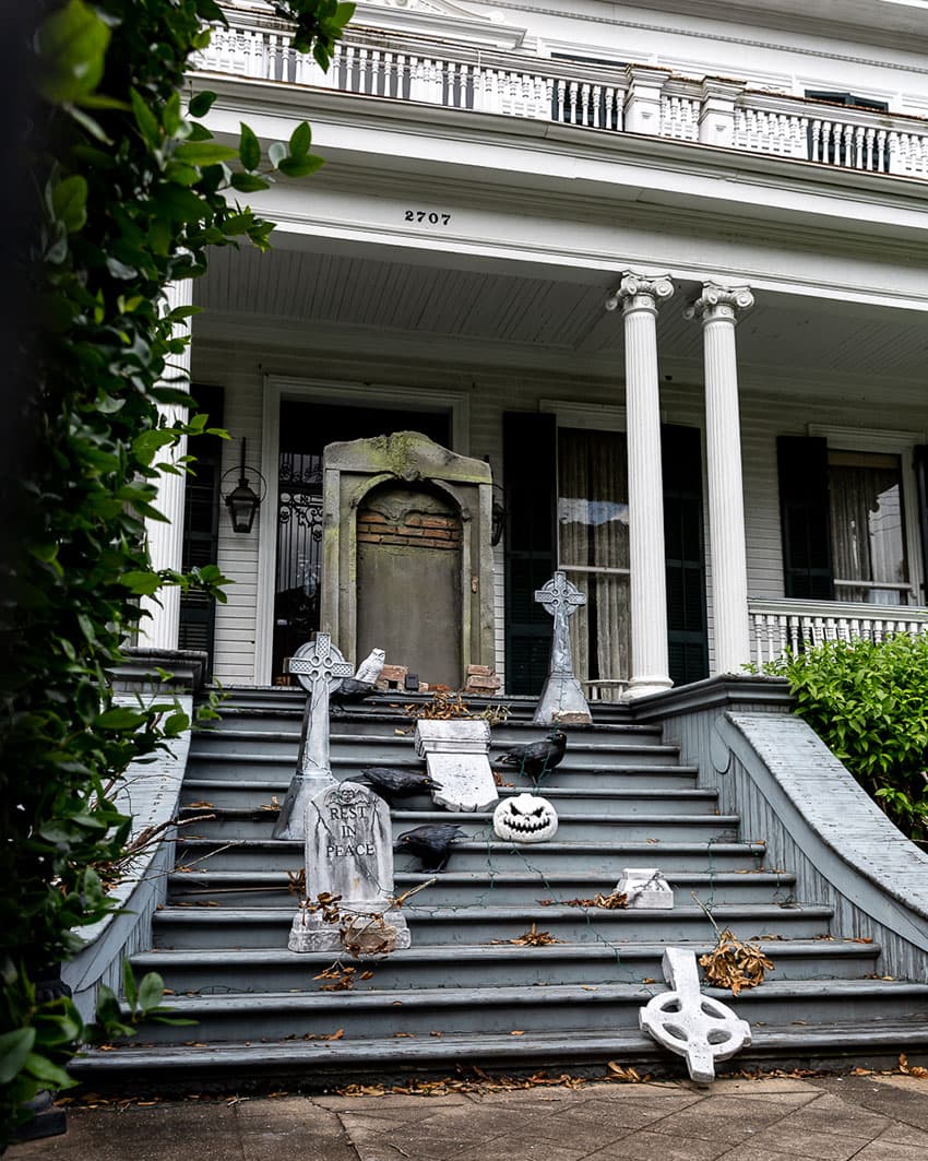 This isn’t just the case in touristy French Quarter. As we head to a visit of Lafayette Cemetery No.1, the mansions of the Garden District are the evidence of a similar dedication. Here the skeletons are reading newspapers, sitting in rockers on the front porches and “Crime scene: Do not cross” yellow tape etches across the front doors. Gardens feature the occasional tombstone with RIP signs and pumpkins faces greet you with demonic smiles.
