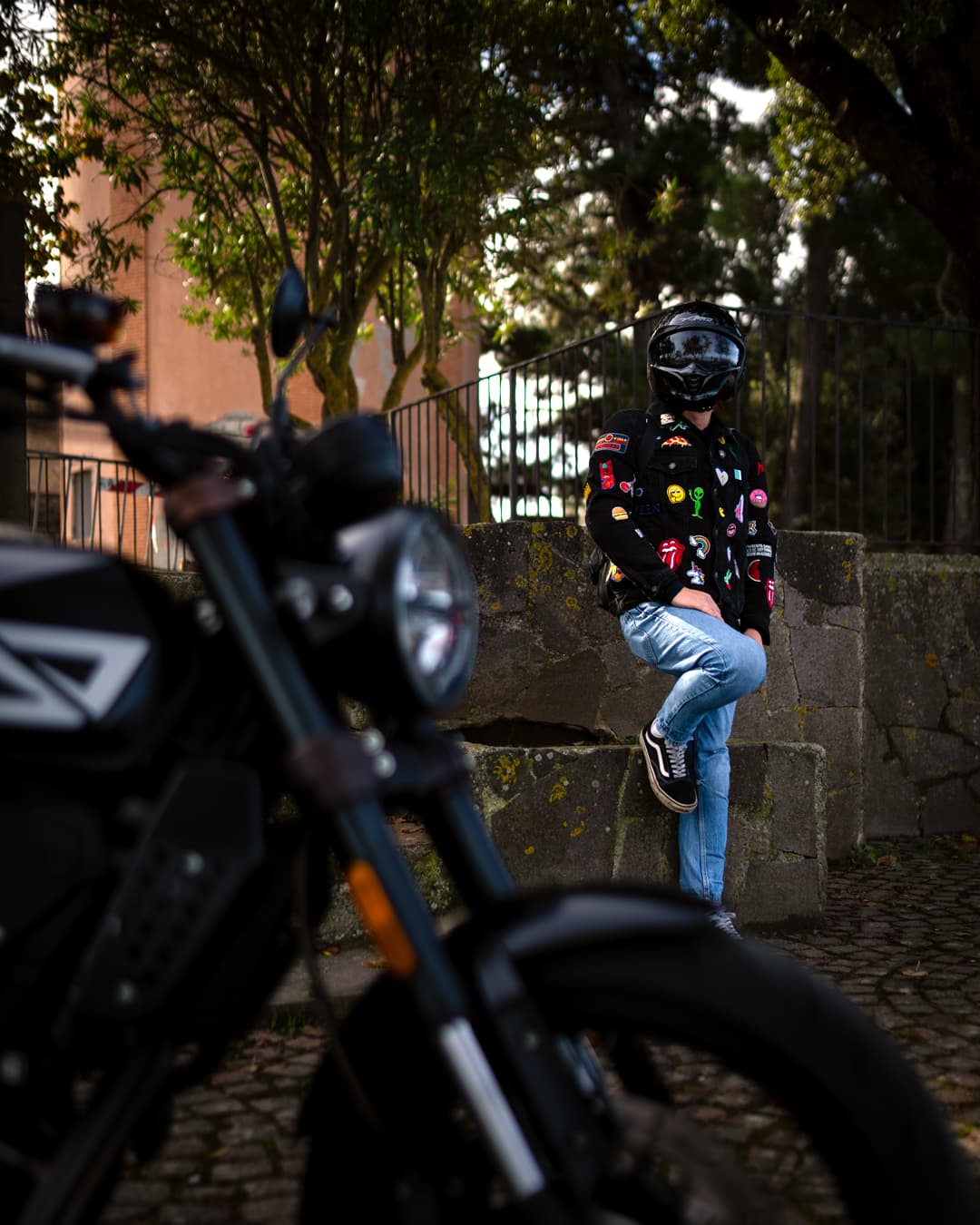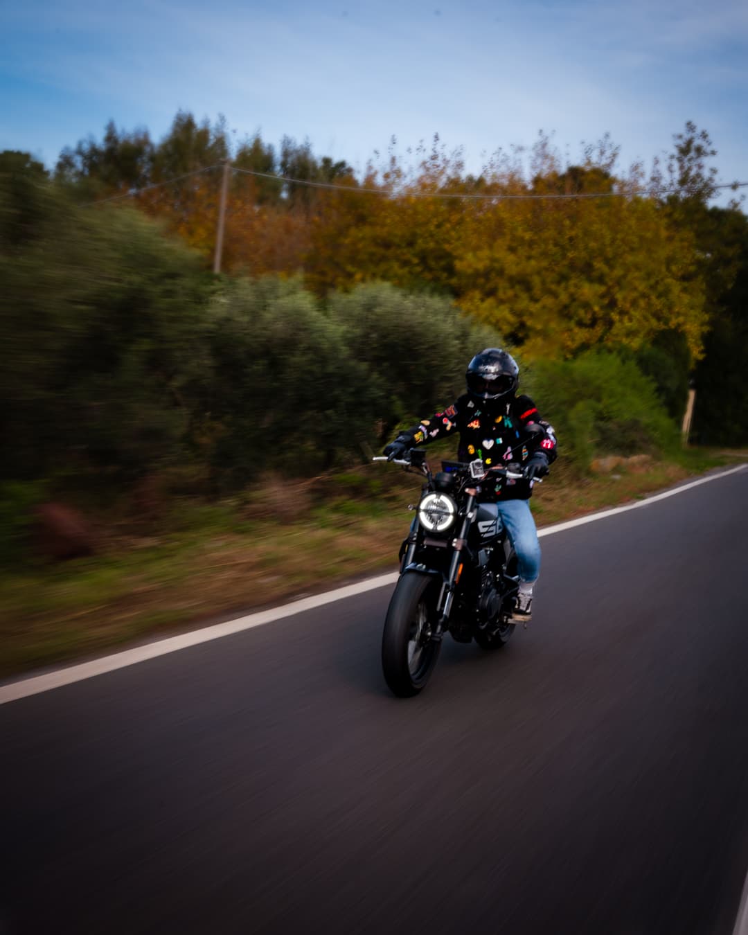 Safety first, so a very good helmet, protective gloves, a jacket with protectors, reinforced trousers and boots. I always try to add my style everywhere, so I made myself a jacket, that I wear upon the protective one, with my favourite patches from all over the world. I collect them during my travels, they’re so meaningful to me.