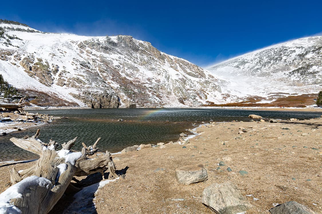 The next days, the expected snowstorm finally hits. We wake up to a world in white, although it only is the beginning of October. Snowflakes dance in the air and cover the gardens and cars. But it comes with a great advantage. It makes our hike up to St. Mary’s Glacier only prettier. The path leads us through a forest of snow-covered trees up to St. Mary’s Lake. The wind sprays water over the surface of the lake, creating instant rainbows. There’s even enough snow for a snowball fight. I won’t say who won! ?