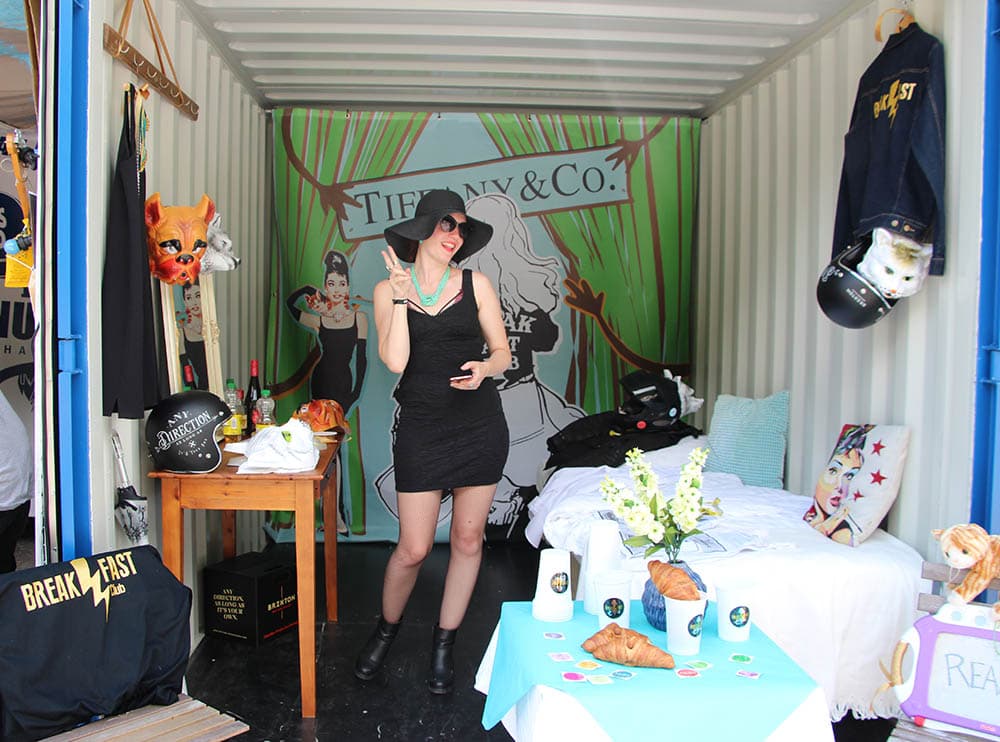 This year’s Rokker Race is all about the motto „Ride your Movie“ – the teams are encouraged to rebuild and design their bikes and the box true to their favourite film. If you look into the box, you immediately know that the Breakfast Club motto will be the film classic „Breakfast at Tiffany’s“. The love lies in the details – coffee and croissant to go on the front of the bike, the artwork of the tank, which also shows the main actress of the film, and the box as the bedroom of Audrey Hepburn – where of course the turquoise sleep mask, the little black one and the pearl necklace should not be missing. And of course the red tomcat „Orangey“ is also part of the party – even at the helmet of the racers!