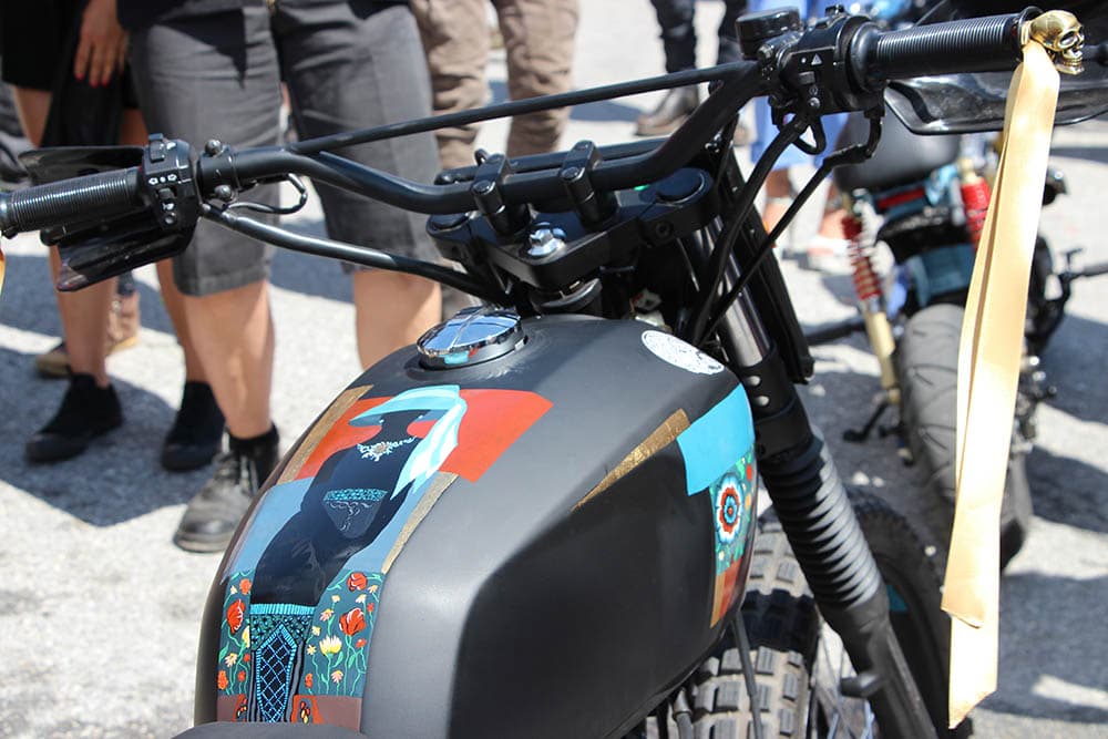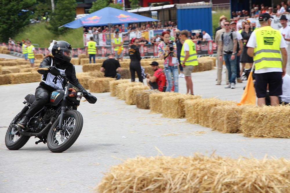The girls from the Breakfast Club greet the enthusiastic spectators of the Rokker Race 2019 in their pits next to the race track in a good mood and shine all over their freshly customized Brixton 125 X called „Audrey“. „She has become so beautiful – we didn’t know until the end whether our plan would work out at all. All the more reason for us to be happy that she has succeeded so well“, Liz and Lille say euphorically.