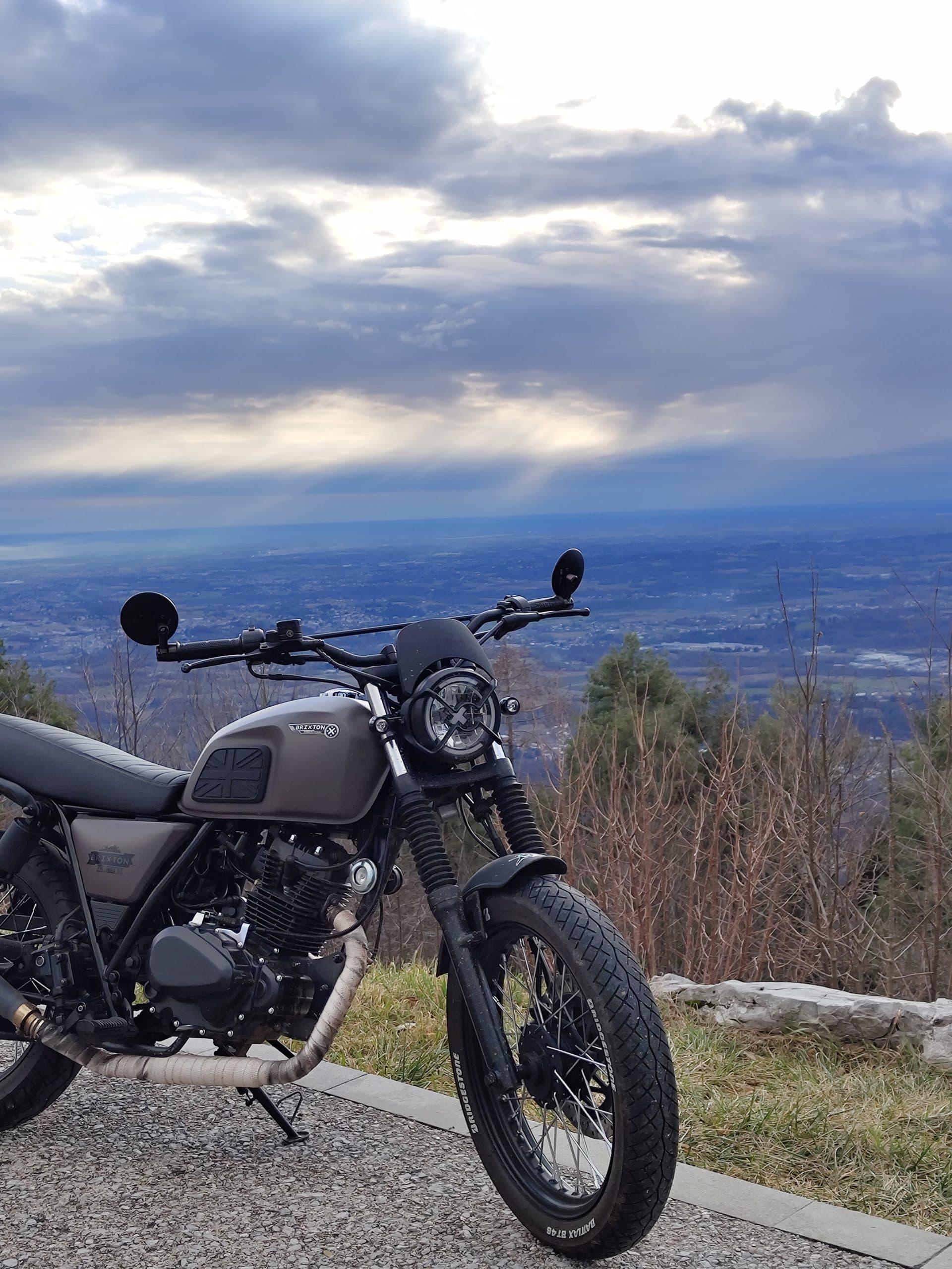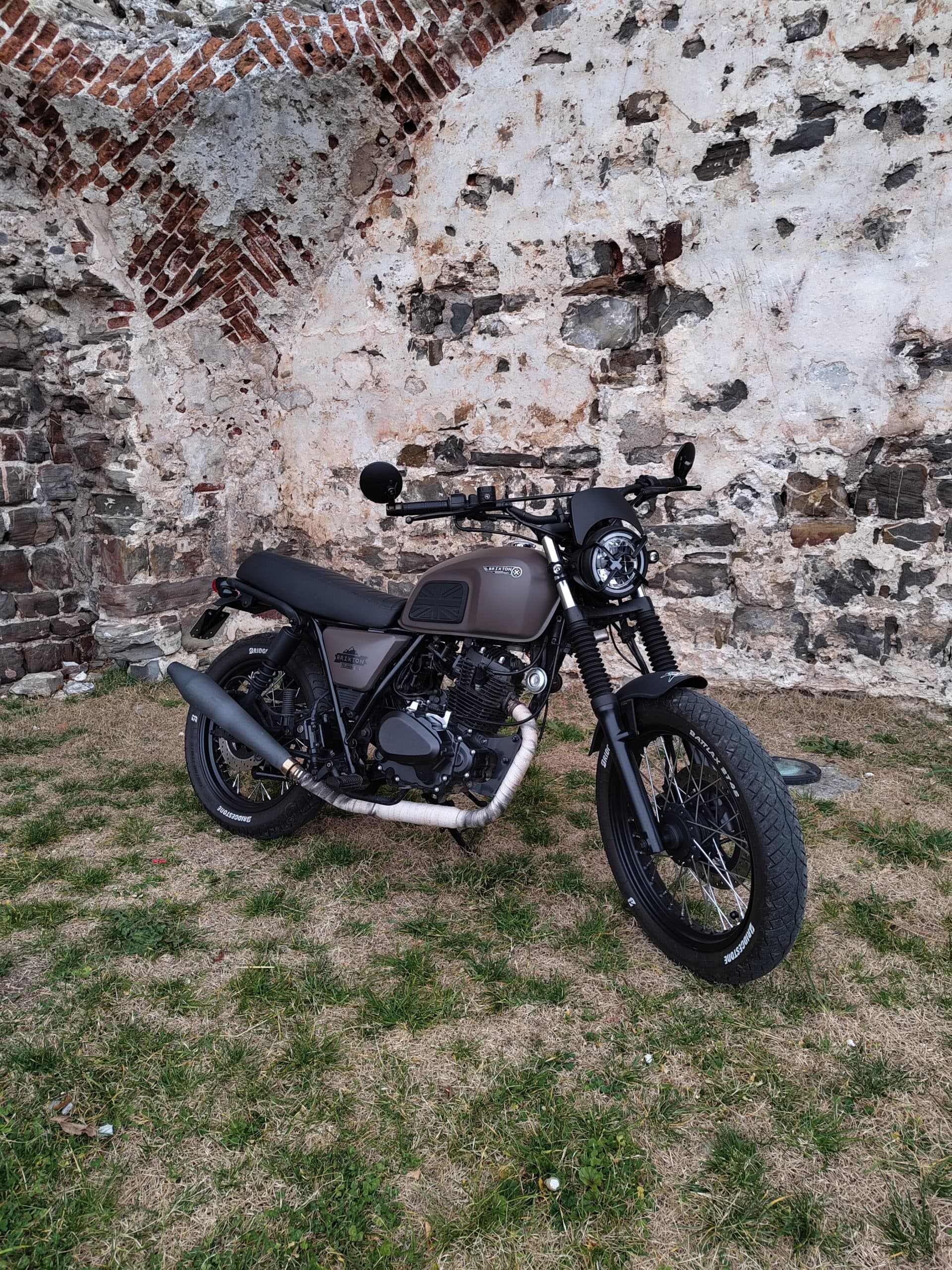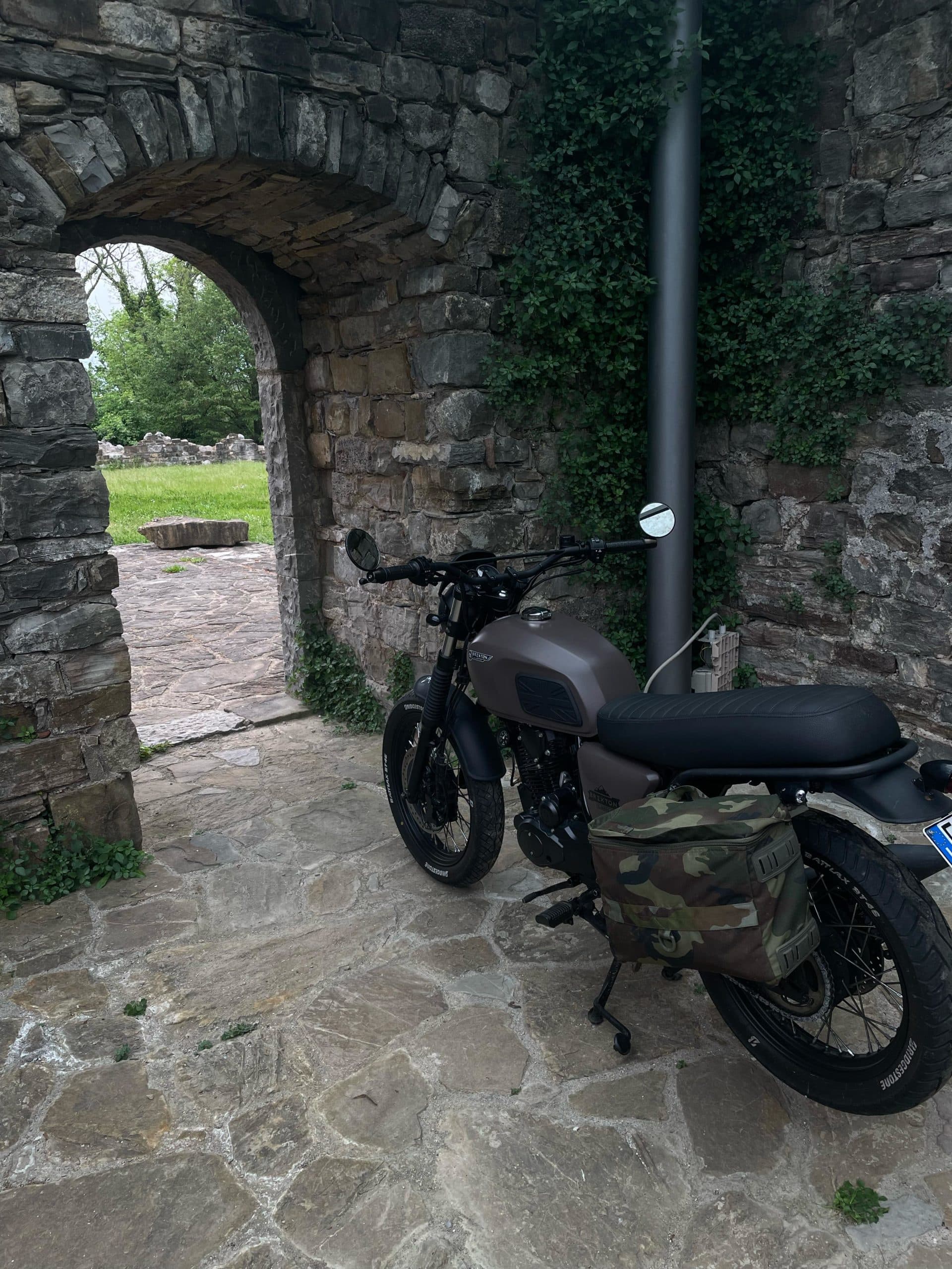On my Brixton I replaced the mirrors, now they are mounted on the sides of the handlebars. I added a bag from the Italian army and shortened the plate holder, so it looks more aggressive.